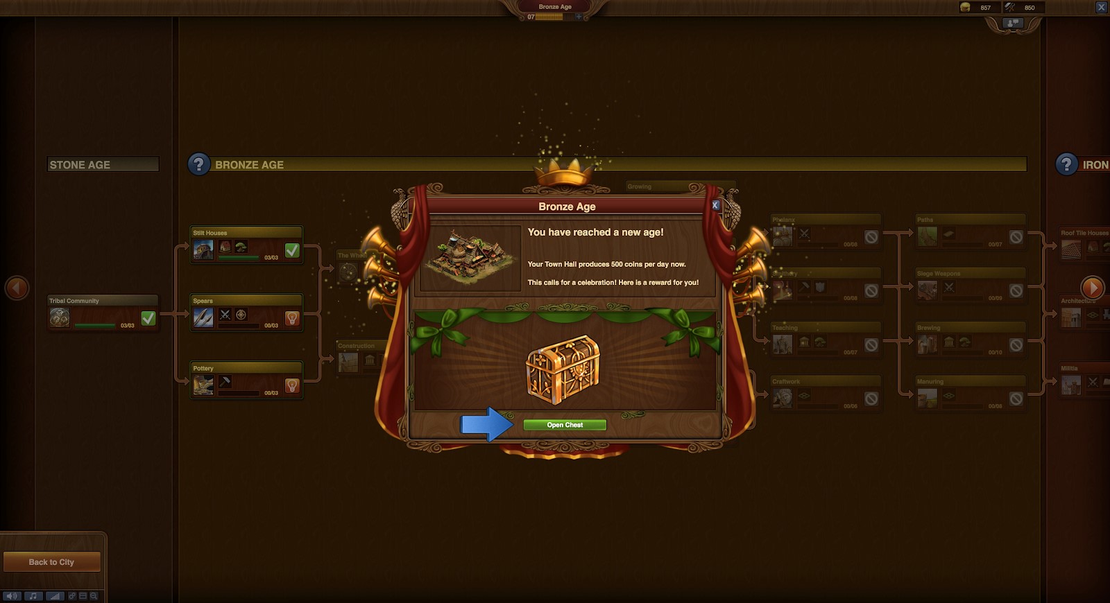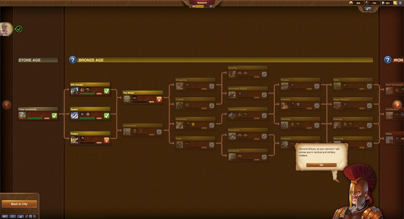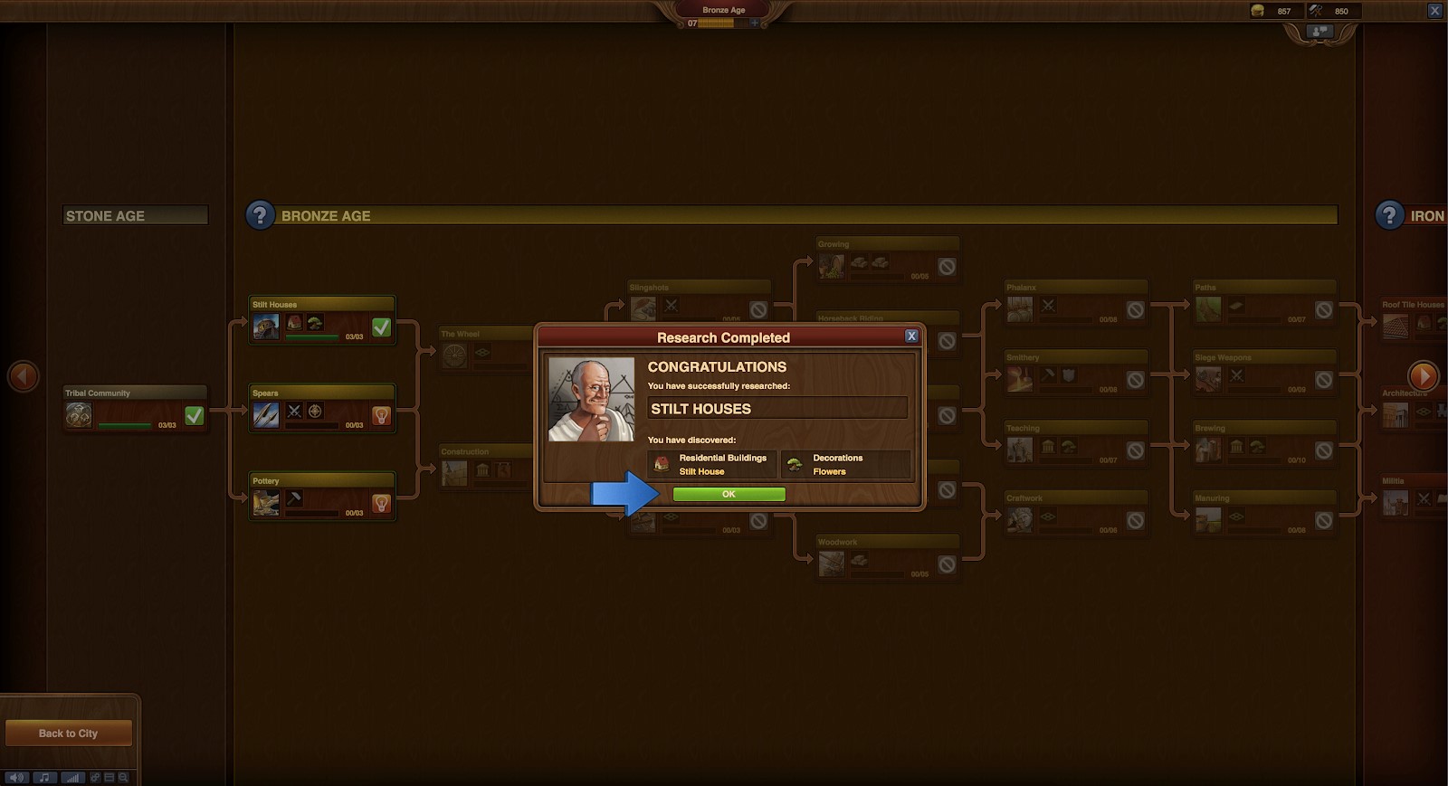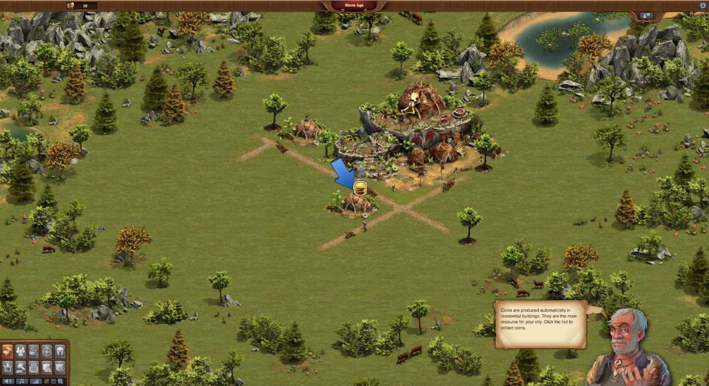 After I built a house for my villagers, the gray-haired guide directed me to the “research” option, which really confused me. One second, I was building in the (literal) Stone Age, but the next second, I was choosing an option that had round bottom and Erlenmeyer flasks. As it turns out, “researching” something means using “Forge points” (similar to XP or experience points, these accumulate over time or through other accomplishments. They can also be purchased for coins) to unlock whatever it is you are researching. Different researched items then unlock more researching capabilities, which eventually let you level up through time.
