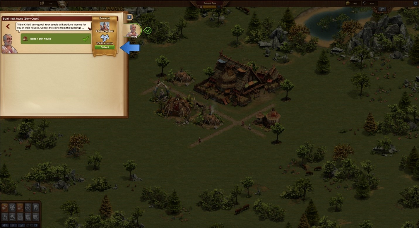 Enter a new guide, who I will call Mr. Trojan. He starts the tutorial of questing and conquering, which is a blog post in and of itself. Look out for that one next. Instead, I am going to wrap up with the last portions of gray-haired guide’s tutorial. Back in my town, which is currently called “emanroe’s City” because I have not come up with something more creative, he directed me to what looks like an objectives or tasks panel: various characters in the game can prompt me to complete certain tasks for rewards here. I think that this is the game maker’s subtle way to direct the players through the different abilities/options in the game without making the tutorial too heavy or arduous.
