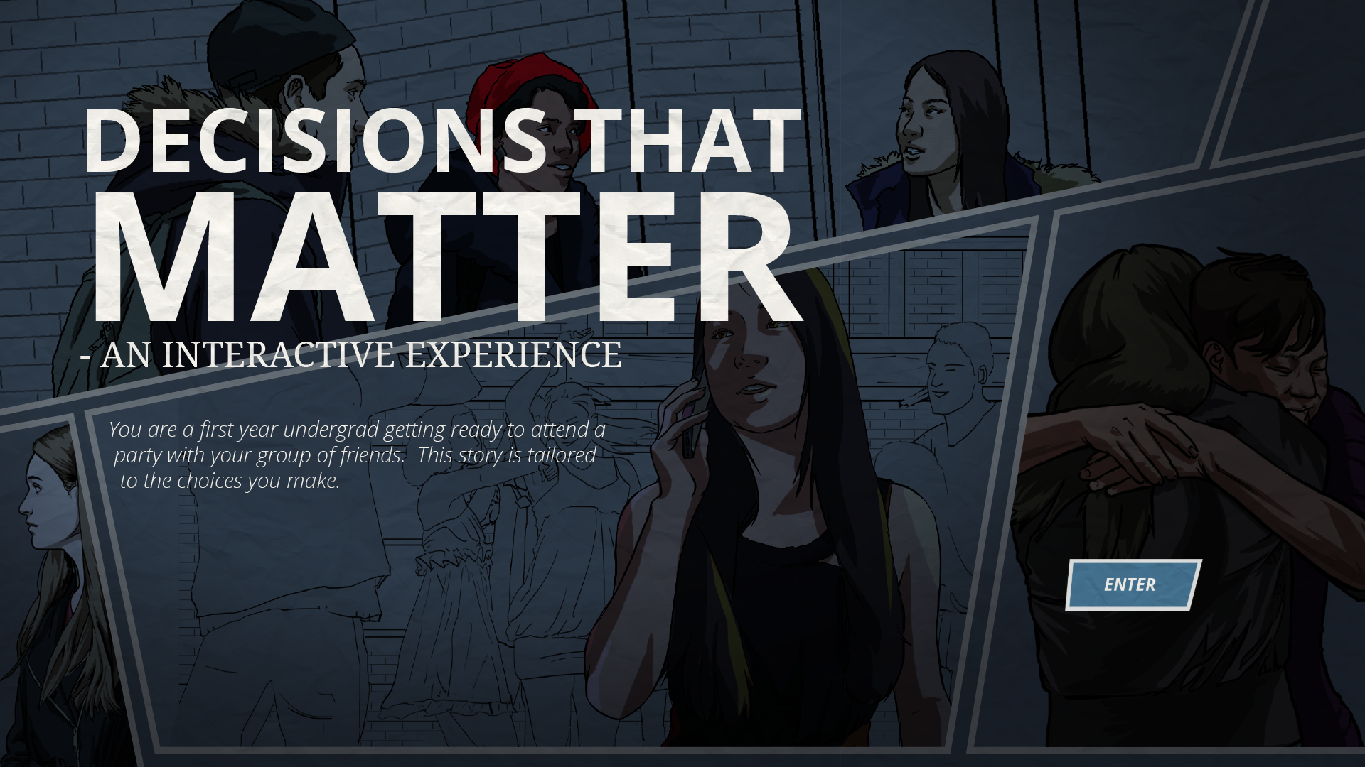 The interactive web comic “Decisions That Matter” jumps off of this idea of morality through video games. Centered around issues of sexual assault and college lifestyles, the comic places users in the middle of mock real-life situations with actual consequences. The user has a certain level of control over the situation, and can choose to intervene or stand by the sidelines. I think that there are two most important parts of this comic: the time and the end. First off, some decisions have time limits, where you only have a few seconds to make a decision. This mirrors real life seamlessly; in the heat of the moment, sometimes you really only have that moment to make a very real decision. This simulation calls on users’ abilities to make fast decisions, and then roll with the consequences (positive or negative) that go along with these choices. For me, however, the most impactful part was the end: Luke and Natalie transition into real people and the whole simulation becomes even more real. Suddenly, these are people who could easily be your friends or your family. These are very real people, just like the very real situations that the user just experienced. This type of explicit transferability to reality is imperative in both making people more aware of their decisions (and the implications of those decisions) as well as arming people with more skills to handle these types of situations.