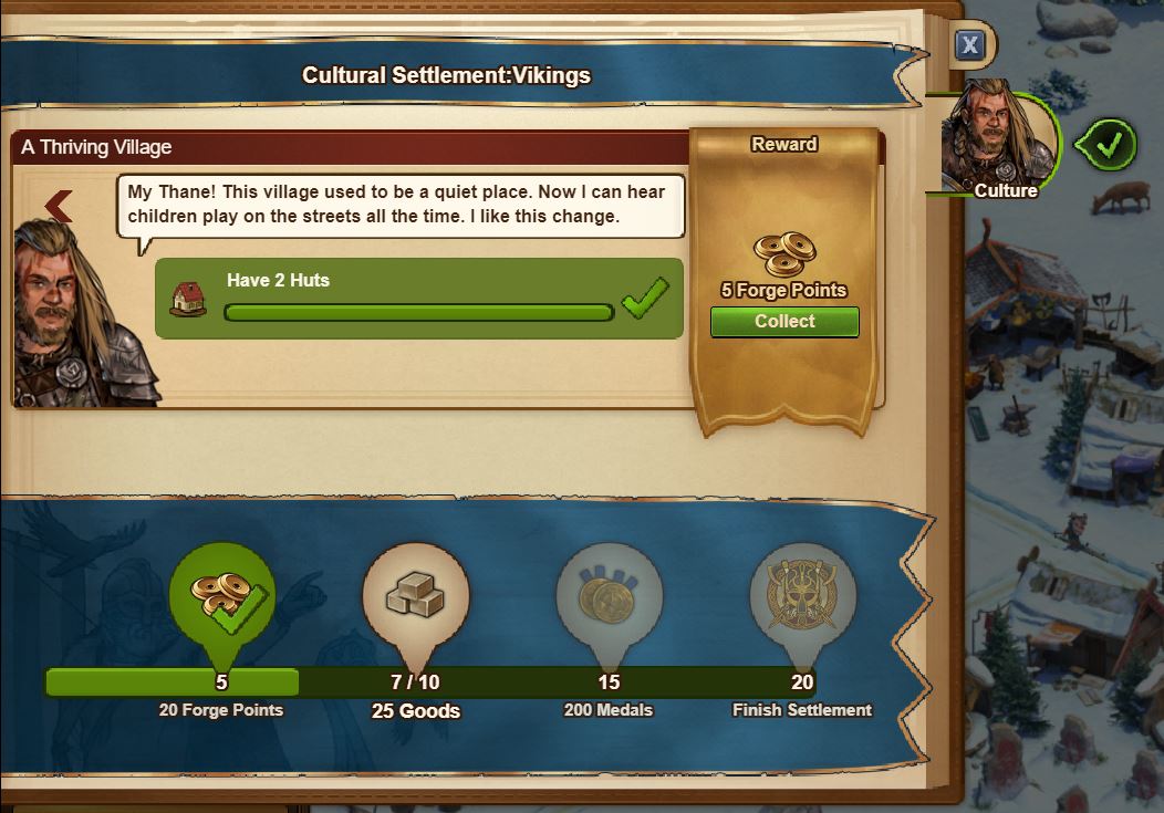 As it turns out, I had unlocked a miniature Viking town that I am in charge of building. Just like my main city, there are a series of quests and objectives that I have to complete in order to progress in the development of the settlement. There are only 25 tasks, however, until the settlement is considered “finished”. I am not exactly sure what it means to have a “finished” settlement and if that will aid me in any way, so we shall see. Until then, it is very similar to my town: residences house people and produce a distinct type of coin (copper coin); production buildings also produce copper coin. Goods buildings currently produce axes and mead, but I still have two more varieties to unlock. Similar to “happiness” in my main city, my settlement has “diplomacy”: points earned through certain cultural buildings and decorations. The settlement’s version of research, called embassy advancements, is fueled by diplomacy and produced goods. So far, I have unlocked four of the possible ten embassy advancements.