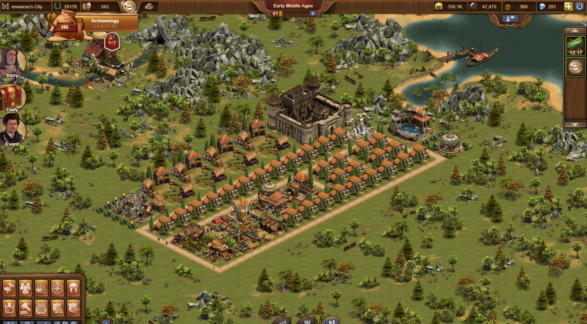 Since last week, I have sold my two triumphant arches and my marketplace in favor of some more residences, a carousel, and some flower bushes. Even though I increased my total number of population and sold these cultural buildings, I actually ended up with more happiness than I had. On top of all of that, I bought a new expansion (far right-hand side) and built a stone mason. I am now able to produce all Bronze Age goods and three of the five Iron Age goods (I am missing cloth and limestone). This is not the most advantageous place to be in since I am currently in the Early Middle Ages, but I have a boosted production of multiple goods; this means that I am able to trade for the goods that I cannot produce (or cannot produce quickly) in the marketplace. So far, I have been managing quite well.