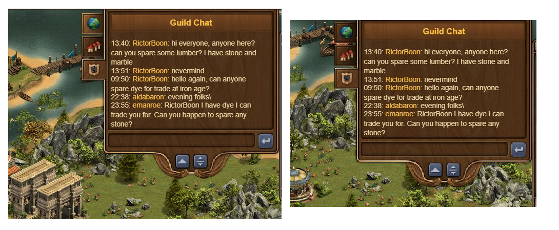No, you are not seeing double; no, I did not accidentally put in the same picture twice. These are two different pictures, taken about a week apart, of our guild’s chat. Nothing. Has. Changed. Here’s the interesting part: Forge of Empires does not tag messages with dates, just times. I sent my message last week at a touch before midnight, but to someone logging on right now, I could have sent that message this past midnight. The same goes for RictorBoon’s message: I could be trying to answer a request that he sent the same day I responded, or three weeks prior! Who knows!
